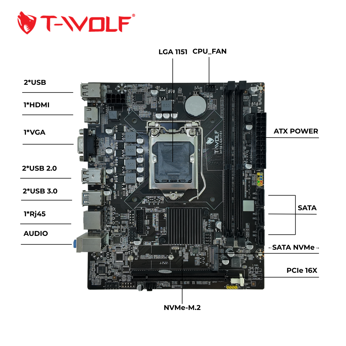 T-WOLF H110 sở hữu thiết kế chắc chắn với các linh kiện chất lượng cao, đảm bảo độ bền bỉ và hoạt động ổn định trong suốt quá trình sử dụng. Bo mạch chủ này hỗ trợ các dòng vi xử lý Intel thế hệ thứ 6 và thứ 7, cung cấp một nền tảng mạnh mẽ cho các nhu cầu công việc và giải trí.